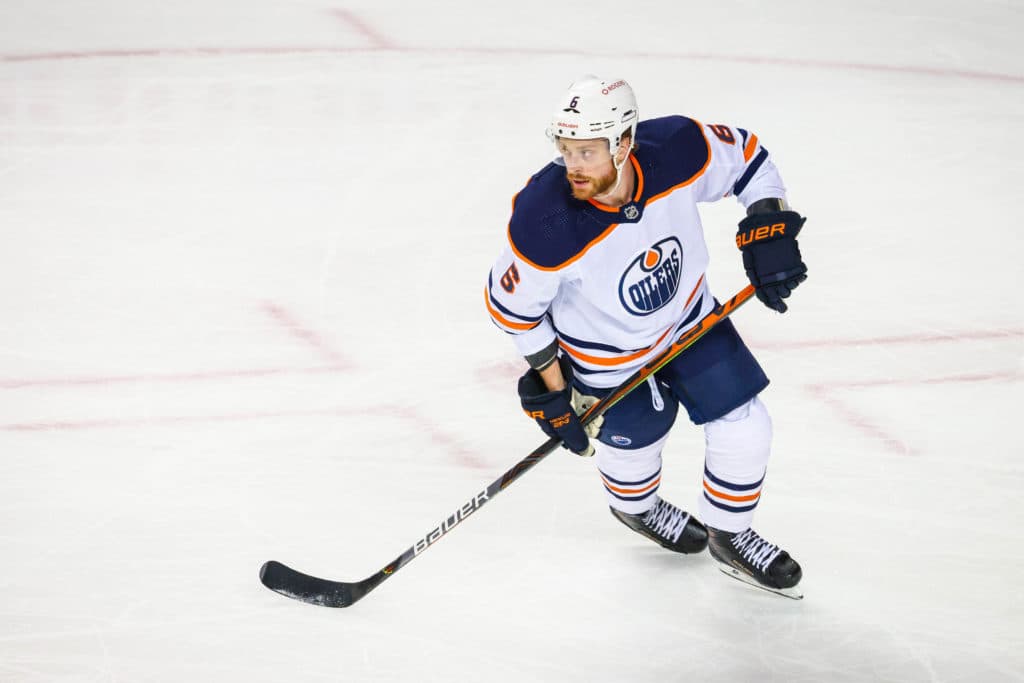 Mar 15, 2021; Calgary, Alberta, CAN; Edmonton Oilers defenseman Adam Larsson (6) skates against the Calgary Flames during the second period at Scotiabank Saddledome. Mandatory Credit: Sergei Belski-USA TODAY Sports