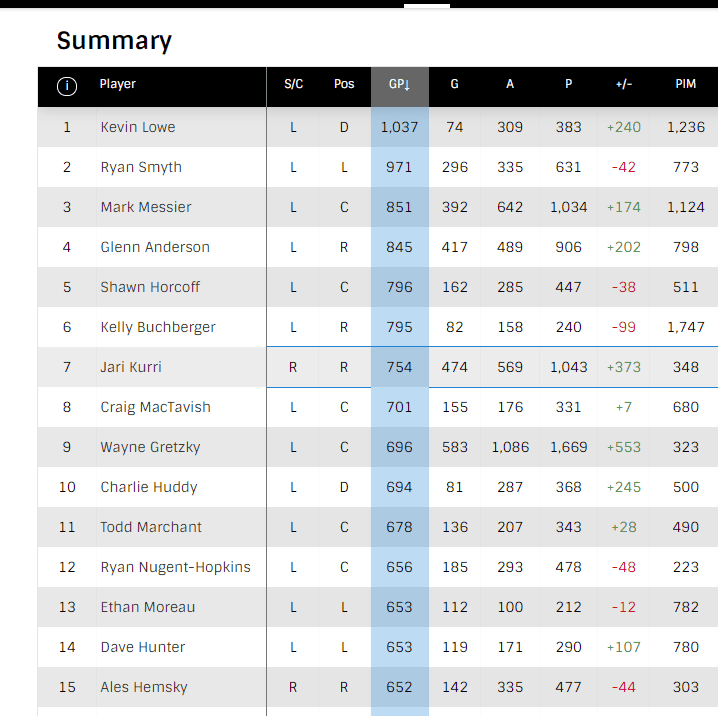 RNH is currently 12th all-time in games played for Edmonton while sitting ninth in goals and 10th in points. He has a great chance to surpass Kevin Lowe in games played, but likely will finish seventh in goals and in points. He has the opportunity to be the longest-serving Oiler of all time and that means something to him.