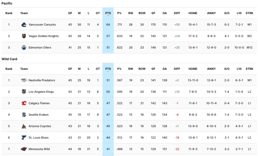 That spot had been occupied by the Los Angeles Kings for the past few weeks, but they’ve been mired in a stretch that’s seen them go 1-5-4 over their last 10 games. L.A. is now in the second Wild Card position, three points ahead of the Kraken and Calgary Flames, who both have 47 points through 45 games.