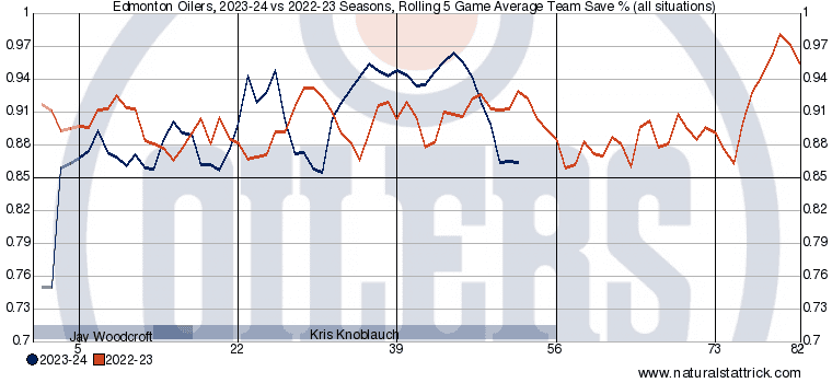 Last year, we saw a bottom-out in early March before a solid rebound through the rest of it and into the Oilers’ six regular season games in April. But come the playoffs, it fell apart of them again. Among all the teams who made it through two rounds of the post-season, the Oilers’ .889 goaltending was second worst to only the New Jersey Devils.
