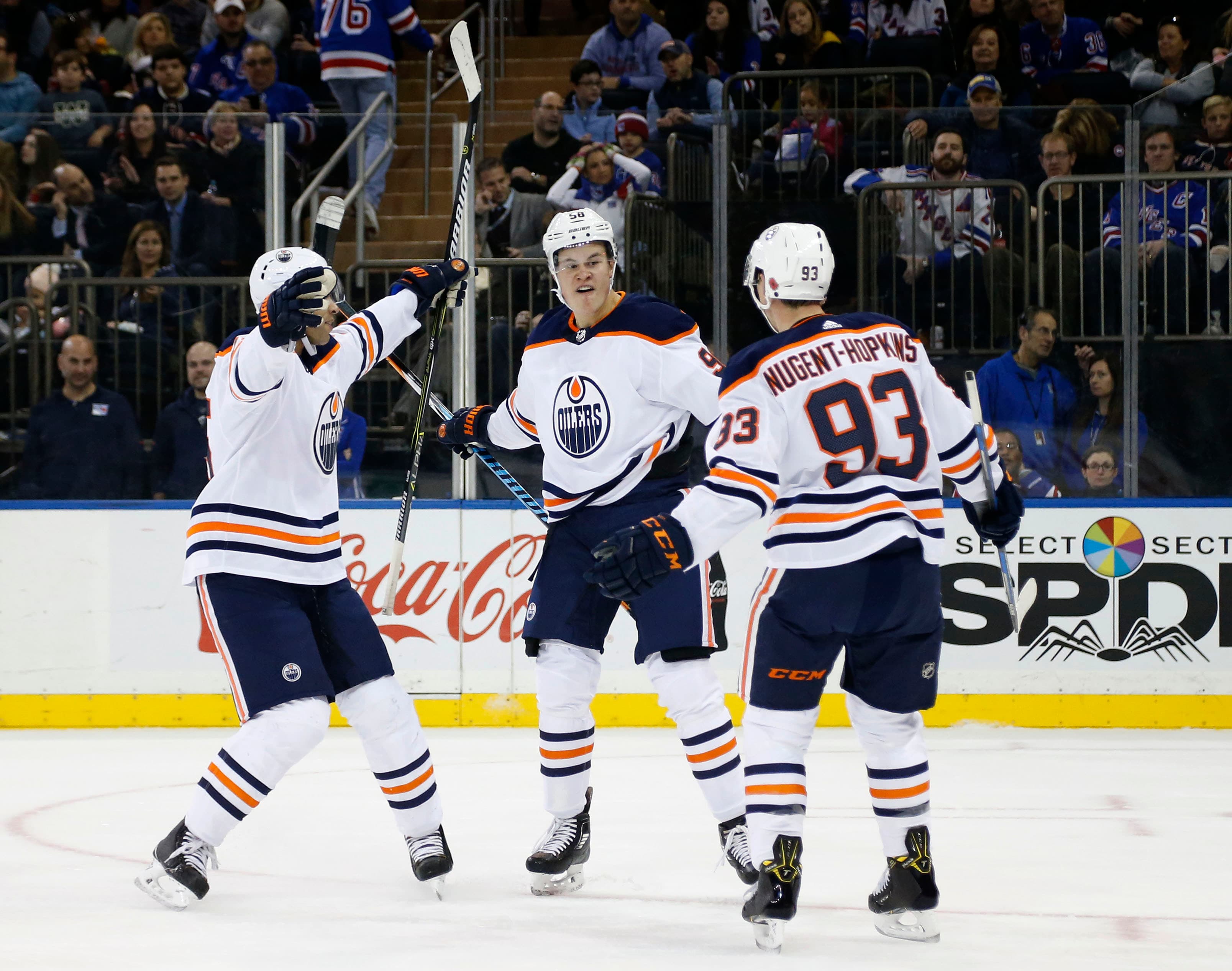 Nov 11, 2017; New York, NY, USA; Edmonton Oilers defenseman Darnell Nurse (25) and center Ryan Nugent-Hopkins (93) congratulate right wing Jesse Puljujarvi (98) after he scored a goal against the New York Rangers during first period at Madison Square Garden. Mandatory Credit: Noah K. Murray-USA TODAY Sports