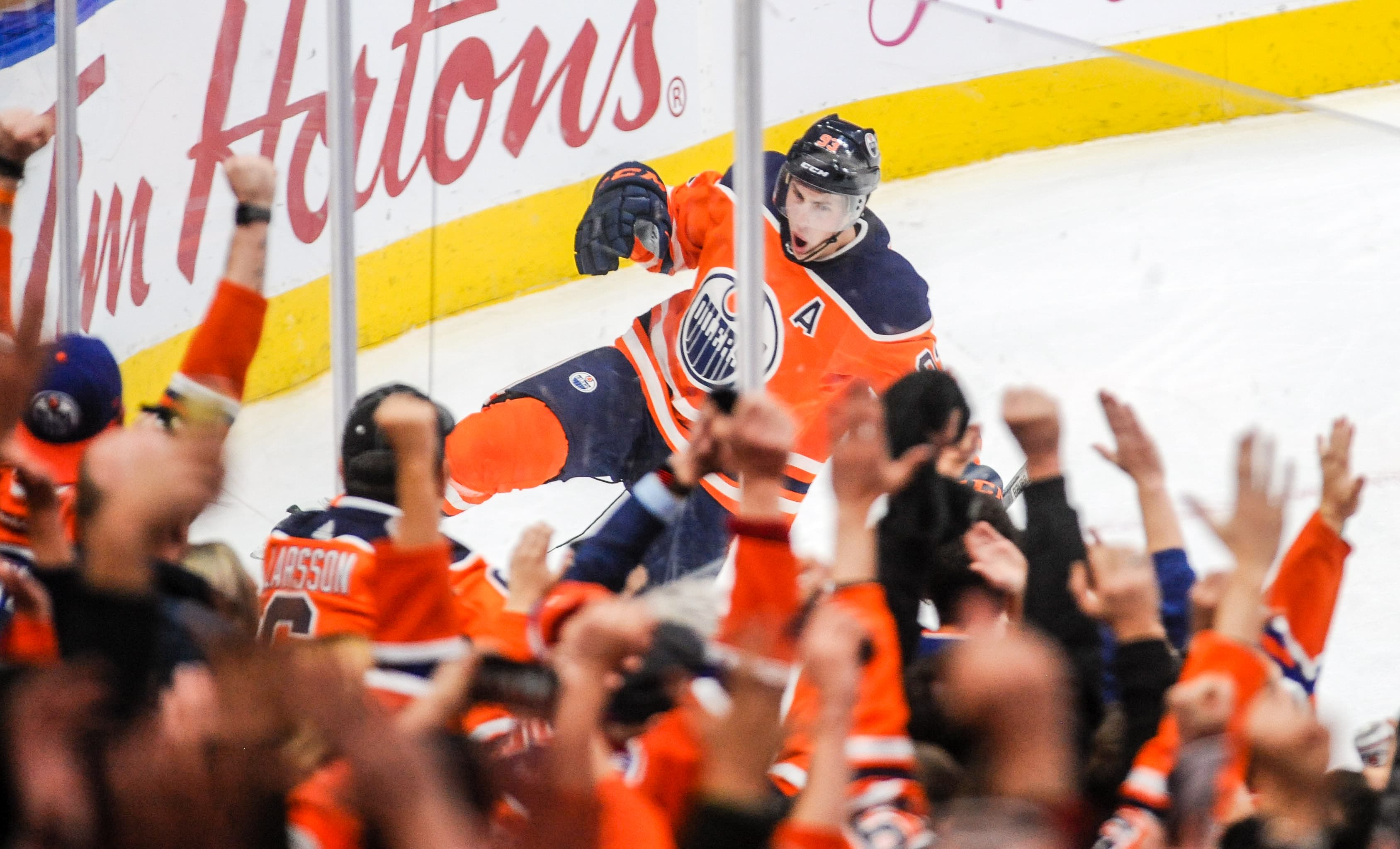 Nov 28, 2017; Edmonton, Alberta, CAN; Edmonton Oilers center Ryan Nugent-Hopkins (93) celebrates his overtime goal against the Arizona Coyotes at Rogers Place. Mandatory Credit: Walter Tychnowicz-USA TODAY Sports