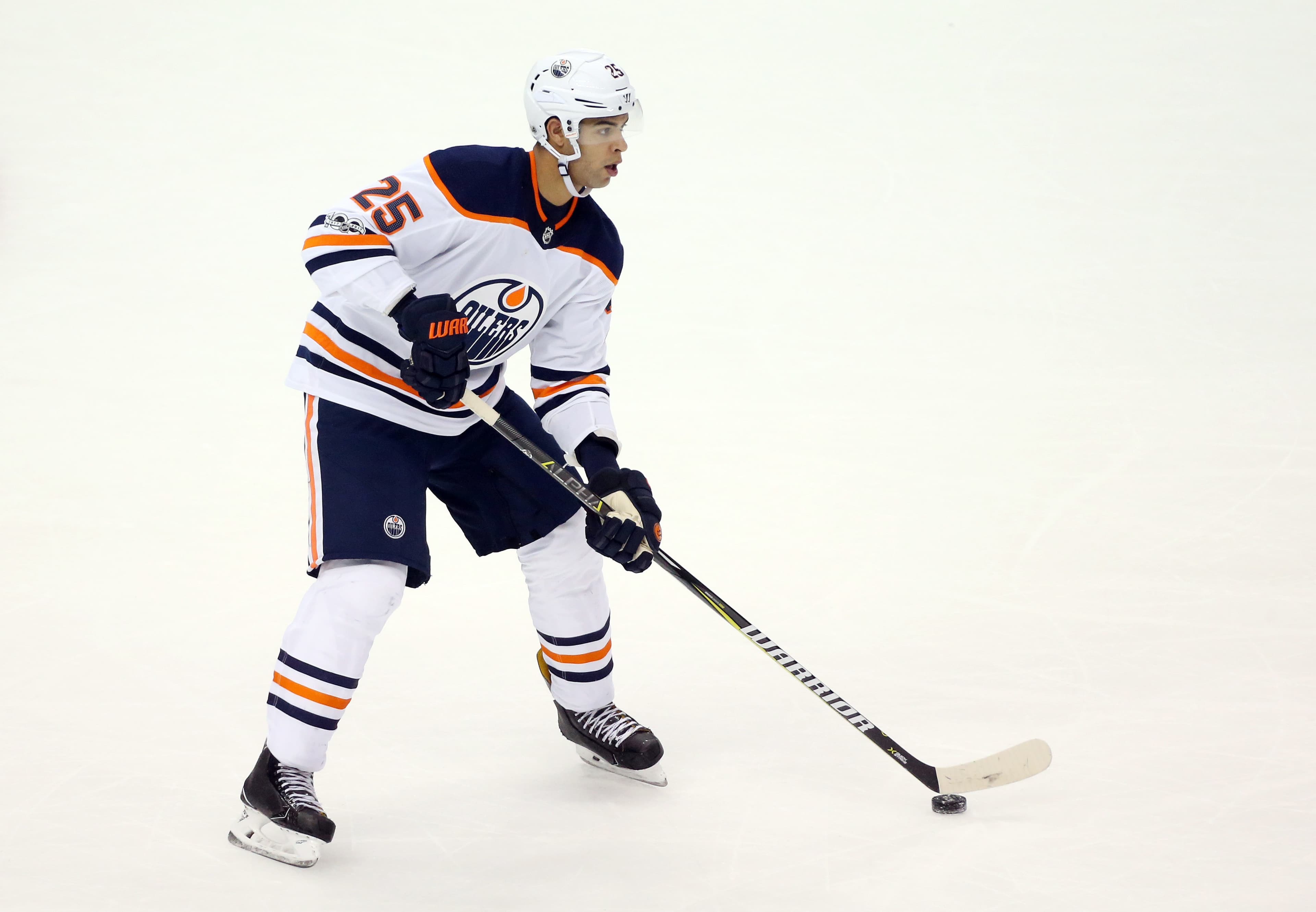 Oct 24, 2017; Pittsburgh, PA, USA; Edmonton Oilers defenseman Darnell Nurse (25) skates with the puck against the Pittsburgh Penguins during the second period at PPG PAINTS Arena. The Penguins won 2-1 in overtime. Mandatory Credit: Charles LeClaire-USA TODAY Sports