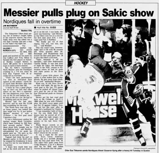 Edmonton had jumped out to a 4-2 lead after the first in thanks to goals from Adam Graves, Craig Simpson, Dave Brown and Craig Muni, but three-second period goals from the Nordiques — two of which were from Sakic — had the game tied at 5.