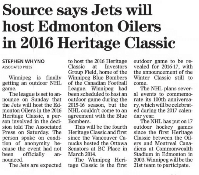 On this day in 2016, the Edmonton Oilers were linked to the 2016 Heritage Classic game by The Associated Press.