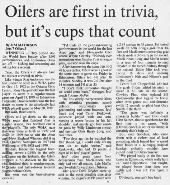 And while the Oilers gave it their best go, the Jets ended up winning the cup in six games. It marked the final games of the World Hockey Association, and game six was played 41 years ago yesterday.