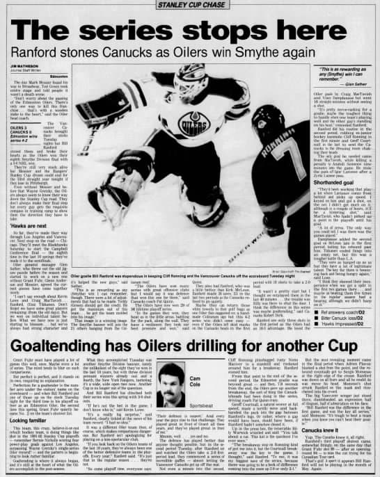 But in game three, Edmonton bounced back with a 5-2 win before taking game four 3-2. Vancouver took a 4-3 win in game five, but in game six, Ranford came to play.