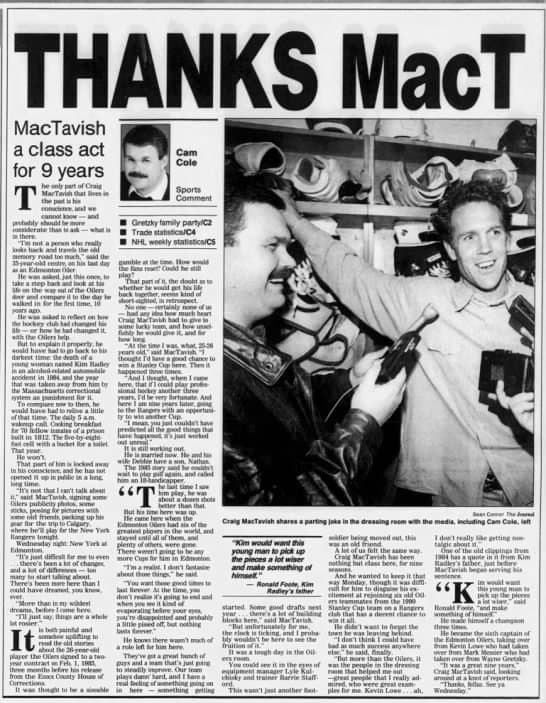 It was a tough day in the Oilers room. You could see it in the eyes of equipment manager Lyle Kulchisky and trainer Barrie Stafford. This wasn’t just another foot soldier being moved out, this was an old friend.A lot of us felt the same way. Craig MacTavish has been nothing but class here, for nine seasons. And he wanted to keep it that way Monday, thought it was difficult for him to disguise excitement at rejoining six old Oilers teammaes from the 1990 Stanley Cup team on a Rangers club that has a decent chance to win it all.