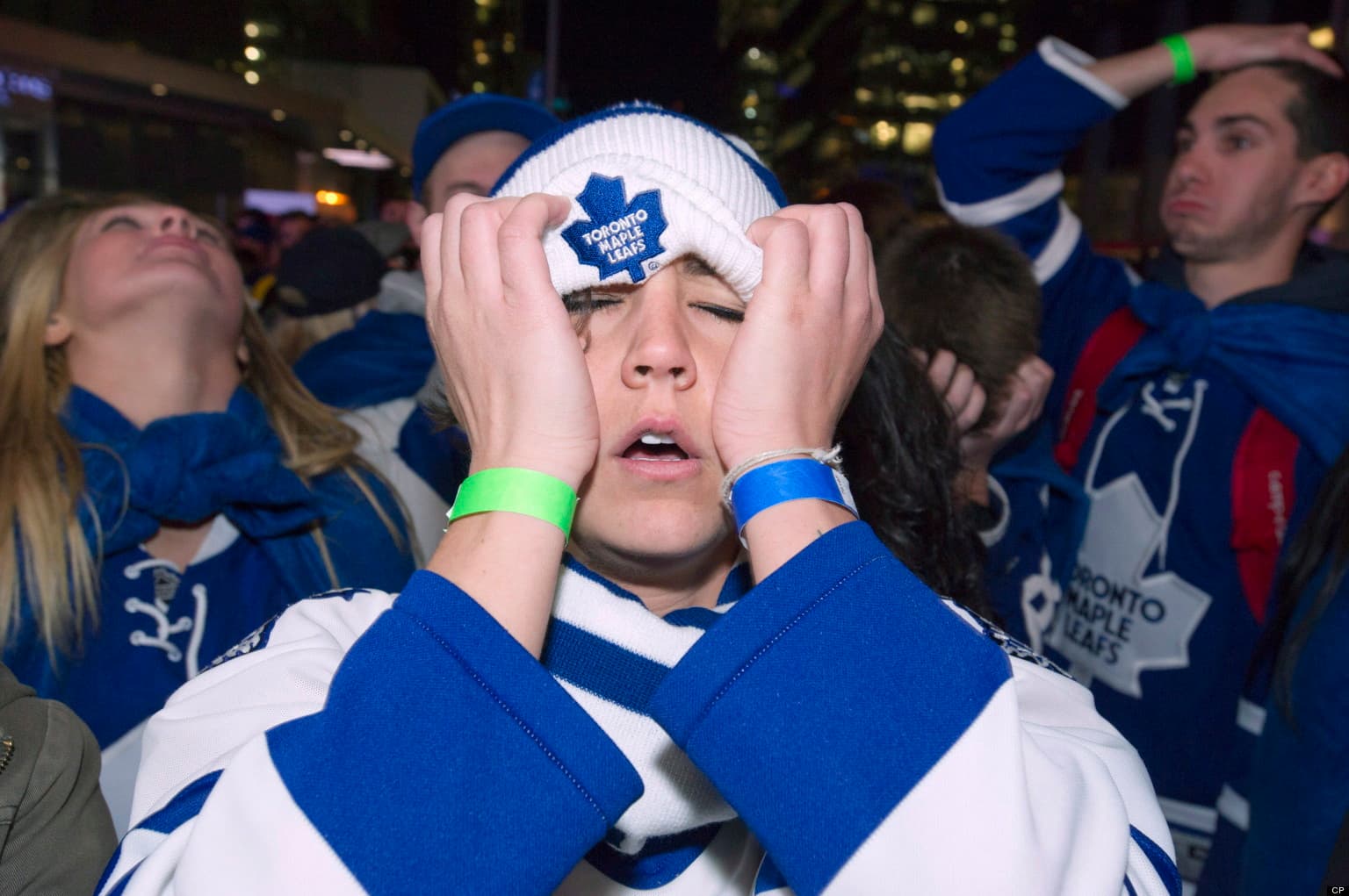 Toronto Maple Leafs fans react to the Boston Bruins fourth goal while watching game 7 third period NHL action against the Boston Bruins at Maple Leafs Square in Toronto on Monday May 13, 2013. THE CANADIAN PRESS/Frank Gunn