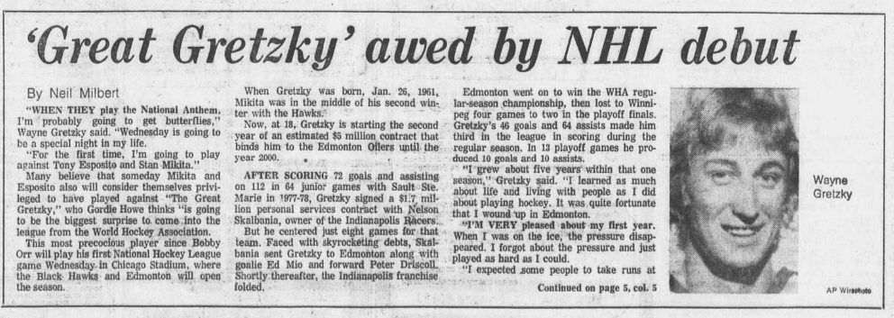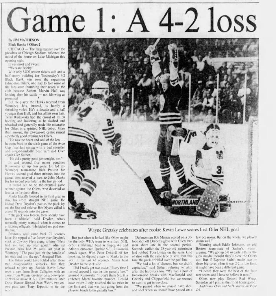 Future Hall of Famer Tony Esposito was the star of the game, stopping 30 of the 32 shots that the Oilers threw his way. Gretzky picked up an assist on Edmonton’s first-ever NHL goal, a power-play marker scored by Kevin Lowe, who had been their first-ever draft pick a few months earlier.