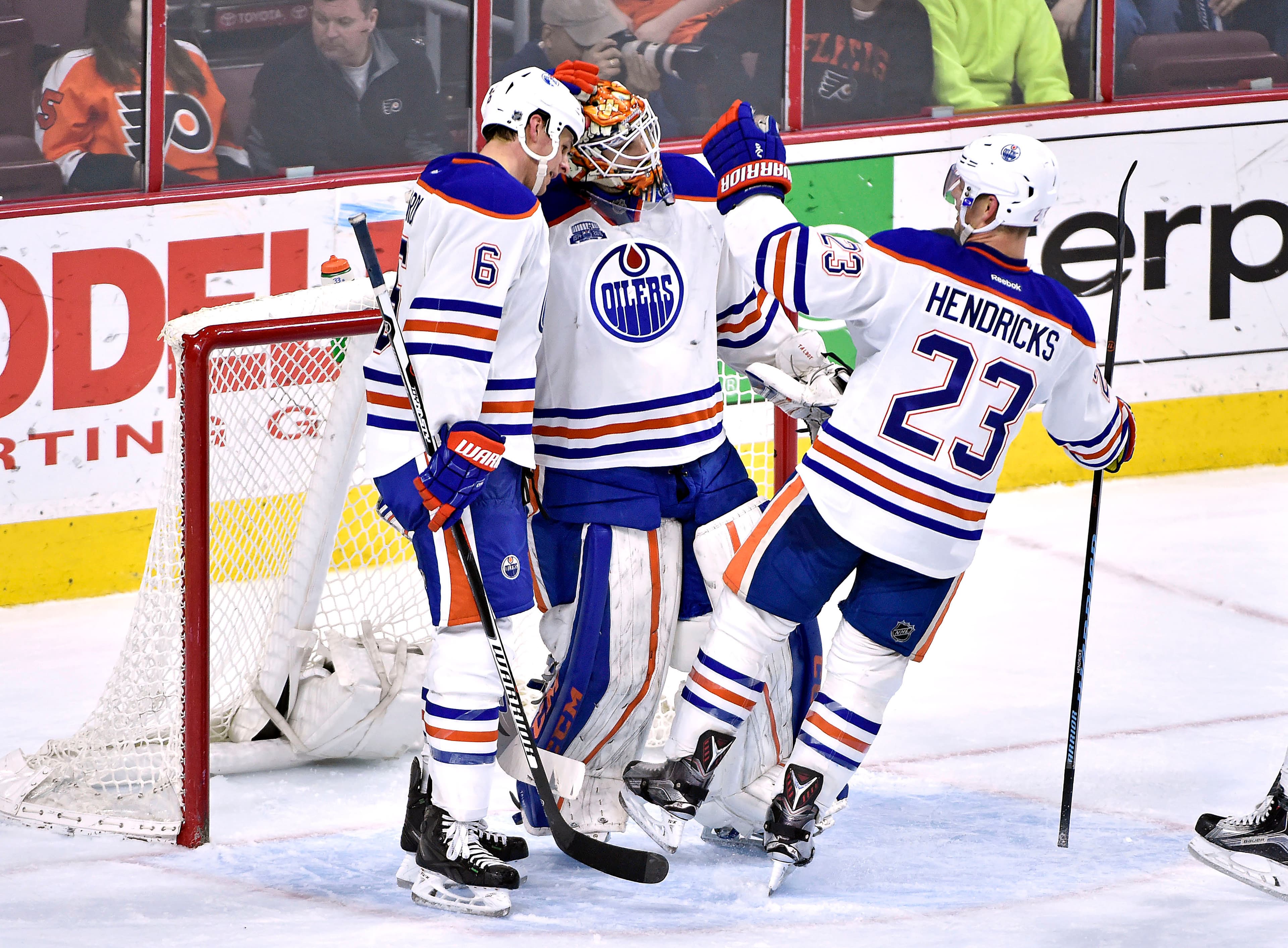 Mar 3, 2016; Philadelphia, PA, USA; Edmonton Oilers defenseman Adam Pardy (6), goalie Cam Talbot (33) and center Matt Hendricks (23) celebrate win against the Philadelphia Flyers at Wells Fargo Center. The Oilers defeated the Flyers, 4-0. Mandatory Credit: Eric Hartline-USA TODAY Sports