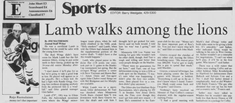 Mark Lamb was on the radar of the Edmonton Oilers in the year before the 1987 NHL Waiver Draft. Lamb, then 22, had drawn in for 22 regular-season games and 11 playoff games for the Detroit Red Wings in the year prior — five of which were in the Campbell Conference Final.