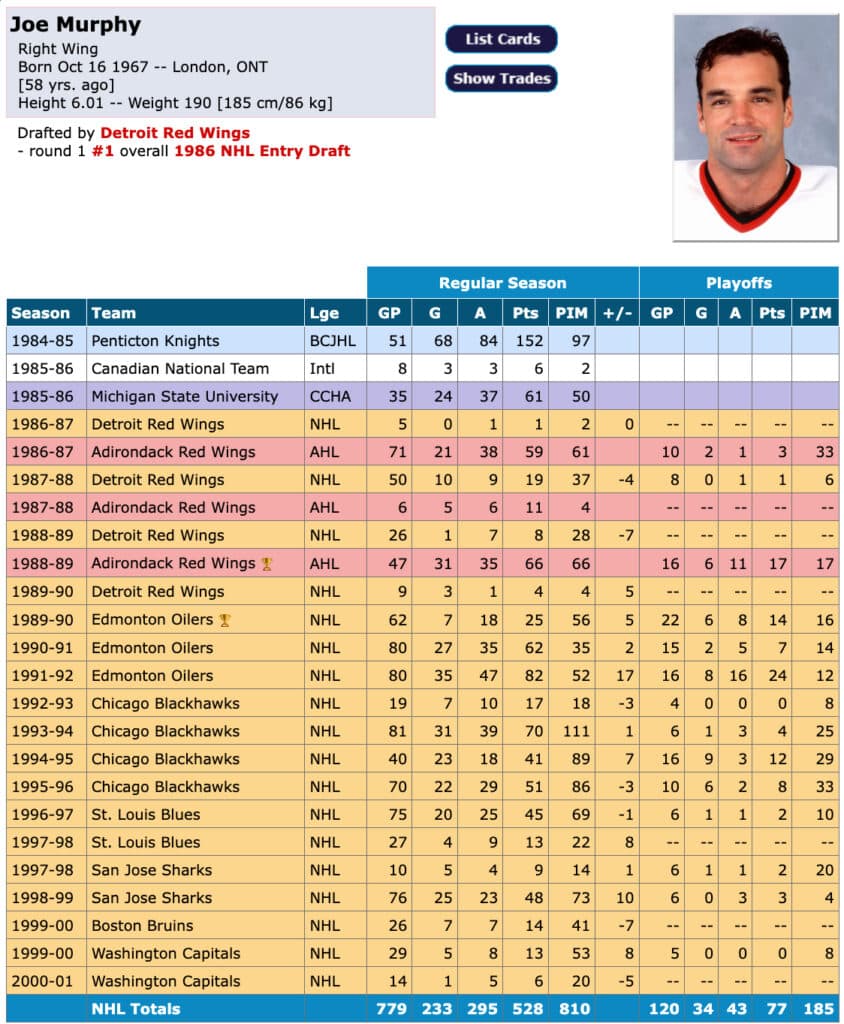 As a first overall draft pick, Murphy was expected to be an impactful player in the NHL. He proved to be worth the hype during the height of his career. His second season with the Oilers was his breakout year, as he obtained 62 points in the 80 games he played, and he closed out his time in Edmonton with over a point per game – in the 80 game season, it was the best year of his career for goals, 35, and points, 82.