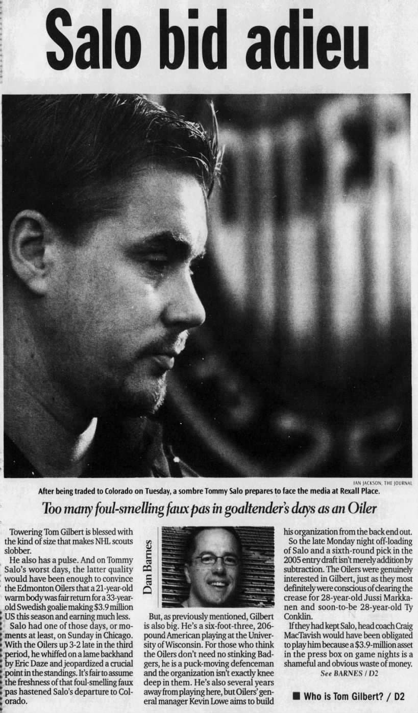Salo arrived in Edmonton in March 1999 in a deal with the New York Islanders, where the Oilers sent back Mats Lindgren and an eighth-round pick that year. The Oilers had an aging goaltending duo for much of the year between 34-year-old Bob Essensa and 33-year-old Mikhail Shtalenkov, who had spent much of the year fighting the puck.