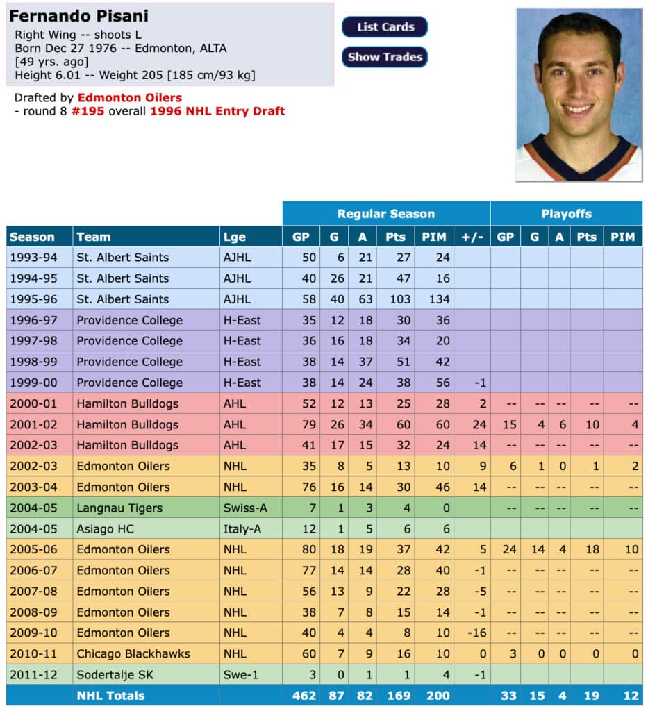 Born in Edmonton, Pisiani was drafted by his hometown Oilers in the eighth-round of the 1996 draft and spent the majority of his career with the team. The 6’1”, 205 lb forward spent four seasons grinding at Providence College, then an additional three seasons in the American Hockey League.