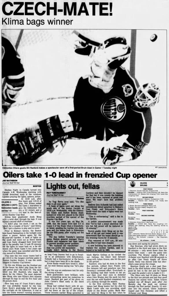 A May 16, 1990 edition of the Edmonton Journal details Petr Klima’s over time winner.