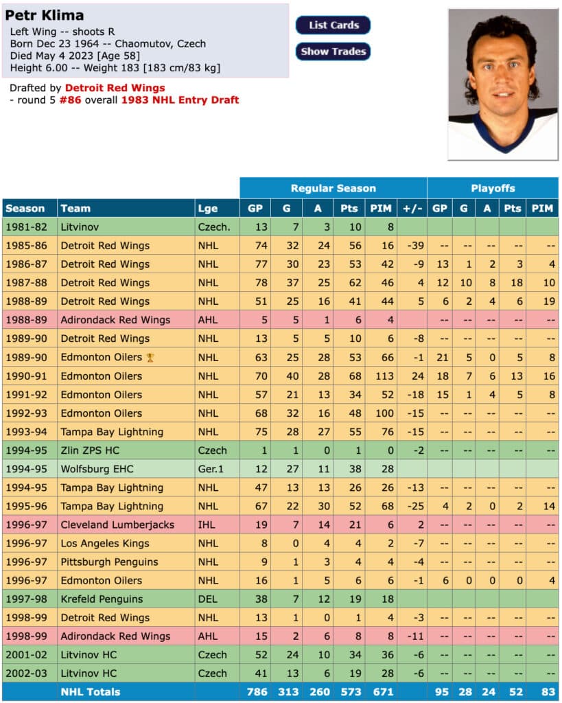 Then, the 1989 trade between the Oilers and Montreal Canadiens saw Edmonton send Jimmy Carson and Kevin McClelland in return for Adam Graves, Joe Murphy, Jeff Sharples — and none other than Klima.