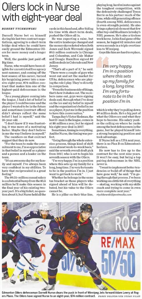 An August 7, 2021, edition of the Edmonton Journal details Darnell Nurse signing an eight-year contract with the Edmonton Oilers.