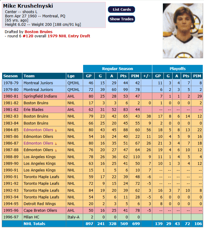 That player is Mike Krushelnyski, a smart and effective player who exploded offensively playing on Wayne Gretzky’s wing in 1984-85, and most famously went with the Great One in the Sale of the Century trade to Los Angeles.