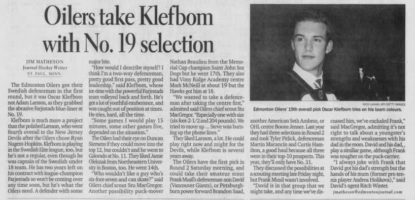 With the first overall pick, they drafted Ryan Nugent-Hopkins, a selection that has worked out well for them. The other first that year was used to select Klefbom with the 19th overall pick. Klefbom, a Swedish left-shot defenceman who played for Färjestad BK, didn’t come to North America until 2013-14, when he played 48 games with the American Hockey League’s Oklahoma City Barons.