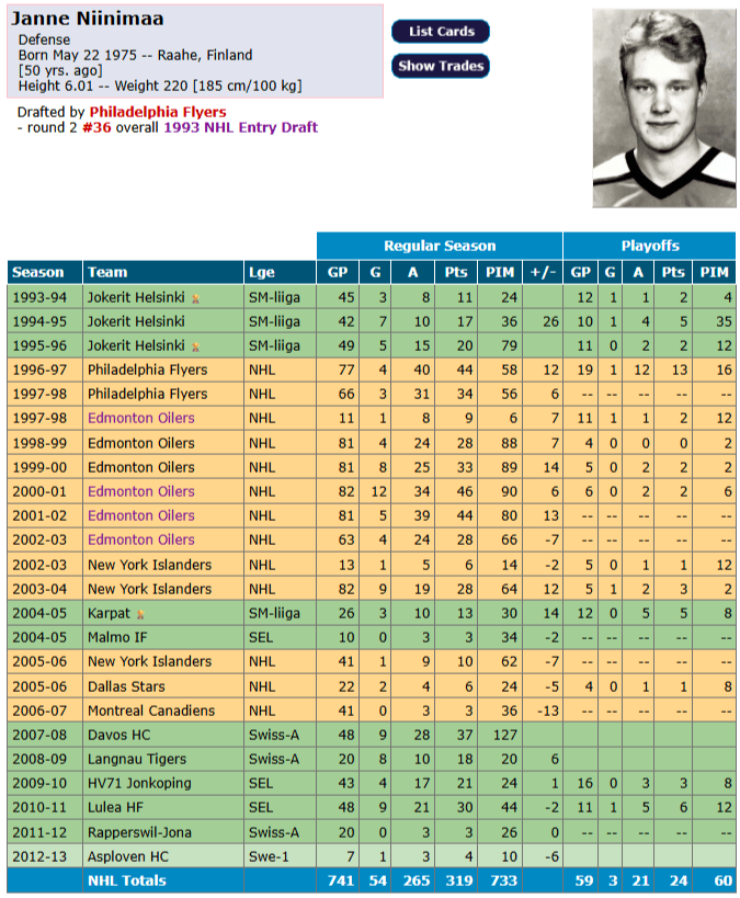 Nevertheless, the Flyers gave up on him in his second year, a contract season. Niiinimaa would play 399 regular-season games with the Oilers and 26 more in the postseason.