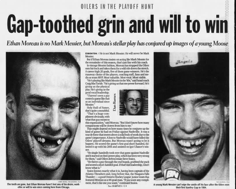 An Edmonton Journal feature from March 21st, 2004, highlights comparisons between Ethan Moreau and Mark Messier, namely their gap-toothed smile.