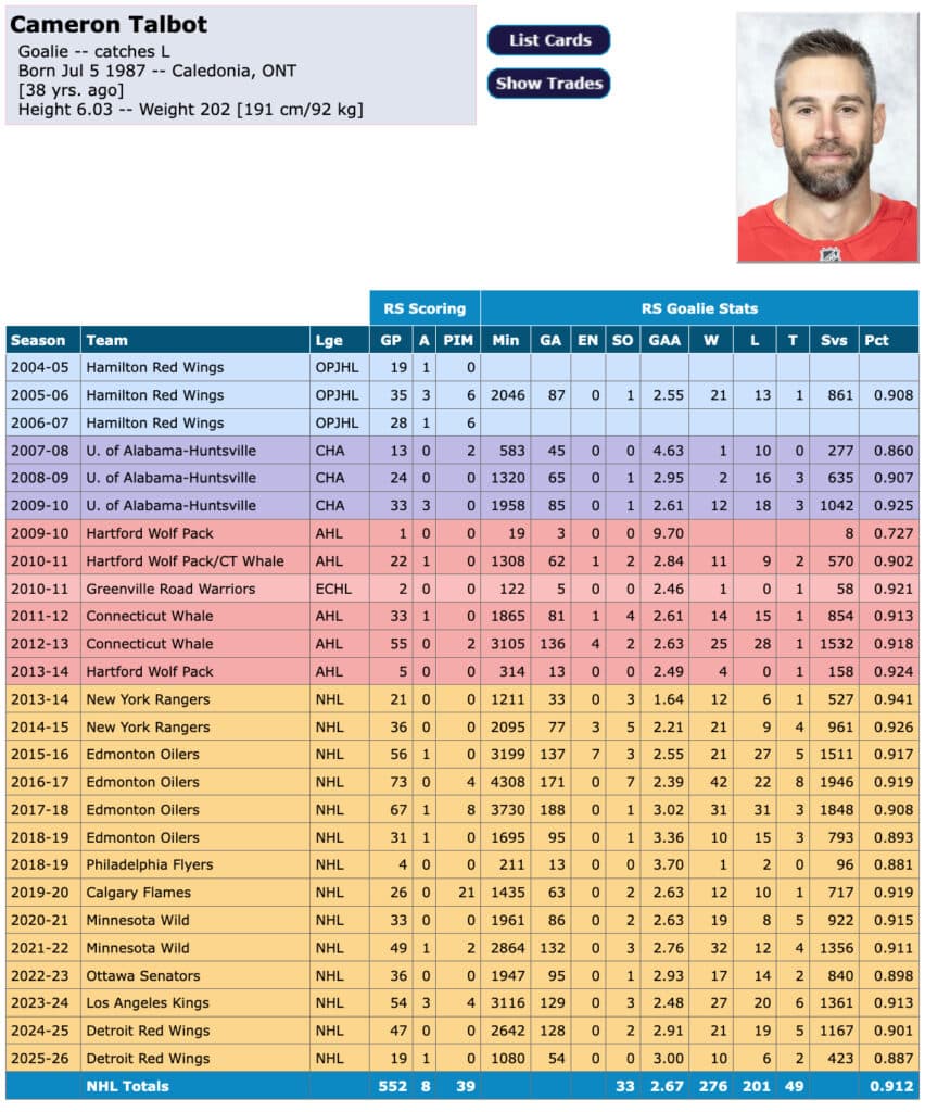 Talbot continues to plug away in the league at 38-years-old and has played 552 games. For an undrafted, unheralded netminder — that’s impressive. This season, with former adversary John Gibson, they might end the Detroit Red Wings’ playoff drought of nine seasons. Sounds eerily familiar.