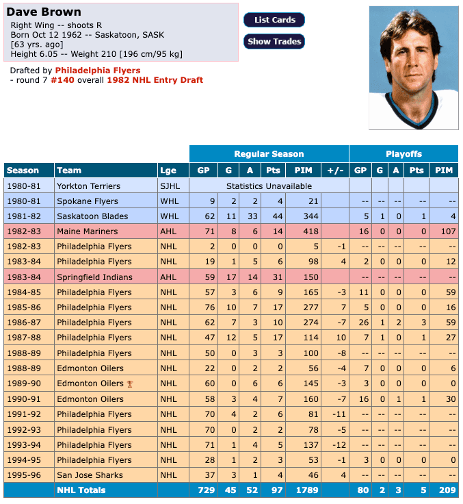 Brown would play five more seasons, carving out a long career despite his dangerous line of work: 729 games, 80 more in the playoffs, 1789 PIMs, and finishing just shy of 100 career points.