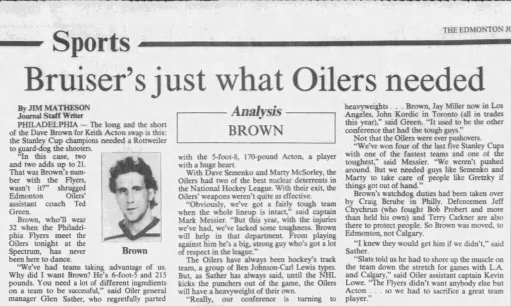 In 1984-85, he stuck full-time with the Flyers. Fast forward to February 1989, Brown’s reputation firmly established, Edmonton acquired his services for Will Acton.