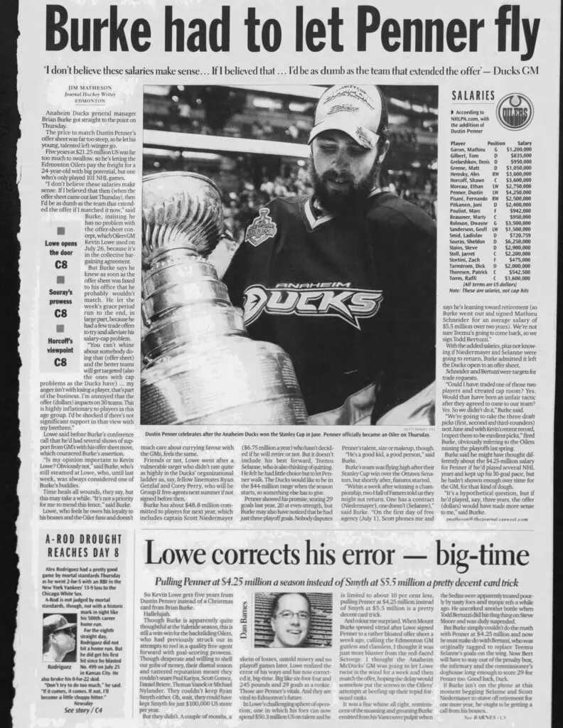 Penner became an Oiler in the summer of 2007 after signing a rare offer sheet with Edmonton — one that the Anaheim Ducks declined to match. Ducks GM Brian Burke was furious, blasting Kevin Lowe publicly and sparking one of the league’s most memorable front-office feuds of the 2000s.