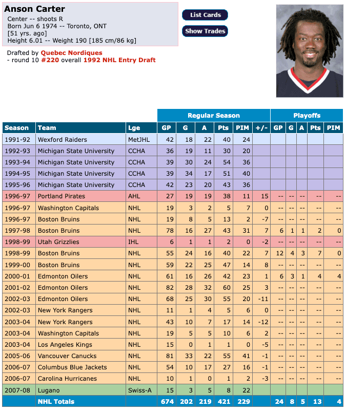 Carter makes my list because of what he did on the ice, but there’s so much more to him. He defied the odds just to make it to the NHL after being drafted 220th overall in 1992. Carter’s work ethic was impeccable. His talent undeniable. Off the ice, his interests were many – he loved exotic cars and took great interest in the entertainment industry, fashion and hip-hop in particular. Carter was the best dressed player I’ve ever seen – no matter what anybody else wore, it looked like they were clad in potato sacks compared to Ace. Carter had it going on. And he could play.Raised in Toronto, history tells us that Carter was a longshot to have any kind of NHL career as a 10th-round draft pick when he finally hit the pros after four seasons with the Michigan State Spartans. Play he did, with his best years coming with the Oilers after being acquired in a November 2000 trade that sent popular and prolific Bill Guerin to the Boston Bruins (the trade also landed the Oilers a first-round pick that turned into Ales Hemsky).
