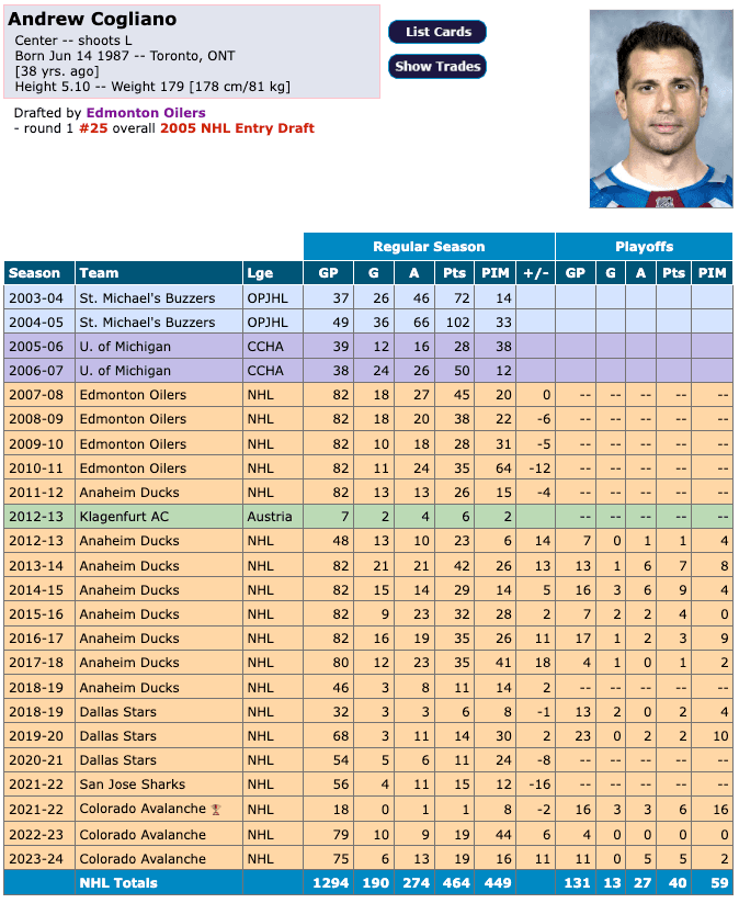 Cogliano would go on to play in San Jose and Dallas before landing in Colorado for the final stop of his career. He captured his one and only Stanley Cup in 2022 while with the Avalanche, eliminating the Oilers in the Western Conference Final.