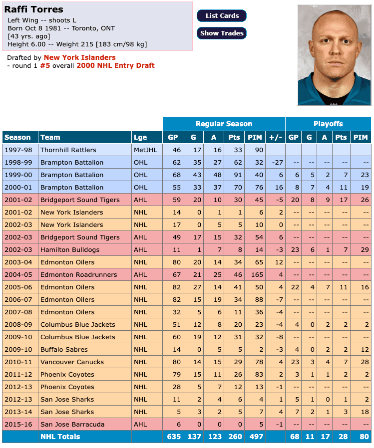 A massive part of Torres’ story is his long rap sheet with the league’s department of player safety. He never had a lot of issues when he was an Oiler, but as the NHL changed, Torres failed to adapt his style.