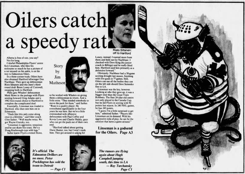The riches prompted the Oilers to move on from Siltanen, then 23. Alongside Brent Loney, he was sent to the Hartford Whalers for Ken Linseman and Don Nachbaur, the former of which became a big part of the 1982-83 and 1983-84 teams.