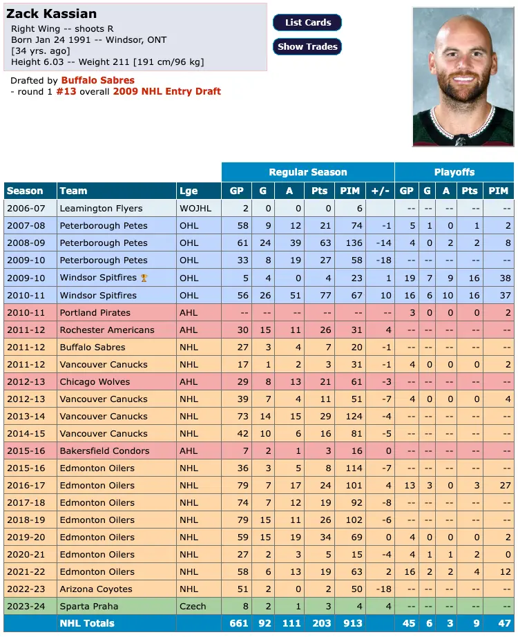 The contract outlived the production. As the Oilers fell into a tough salary cap situation, Kassian was moved to Arizona, where he scored two goals in 51 games. A short stop in Europe followed, then retirement.