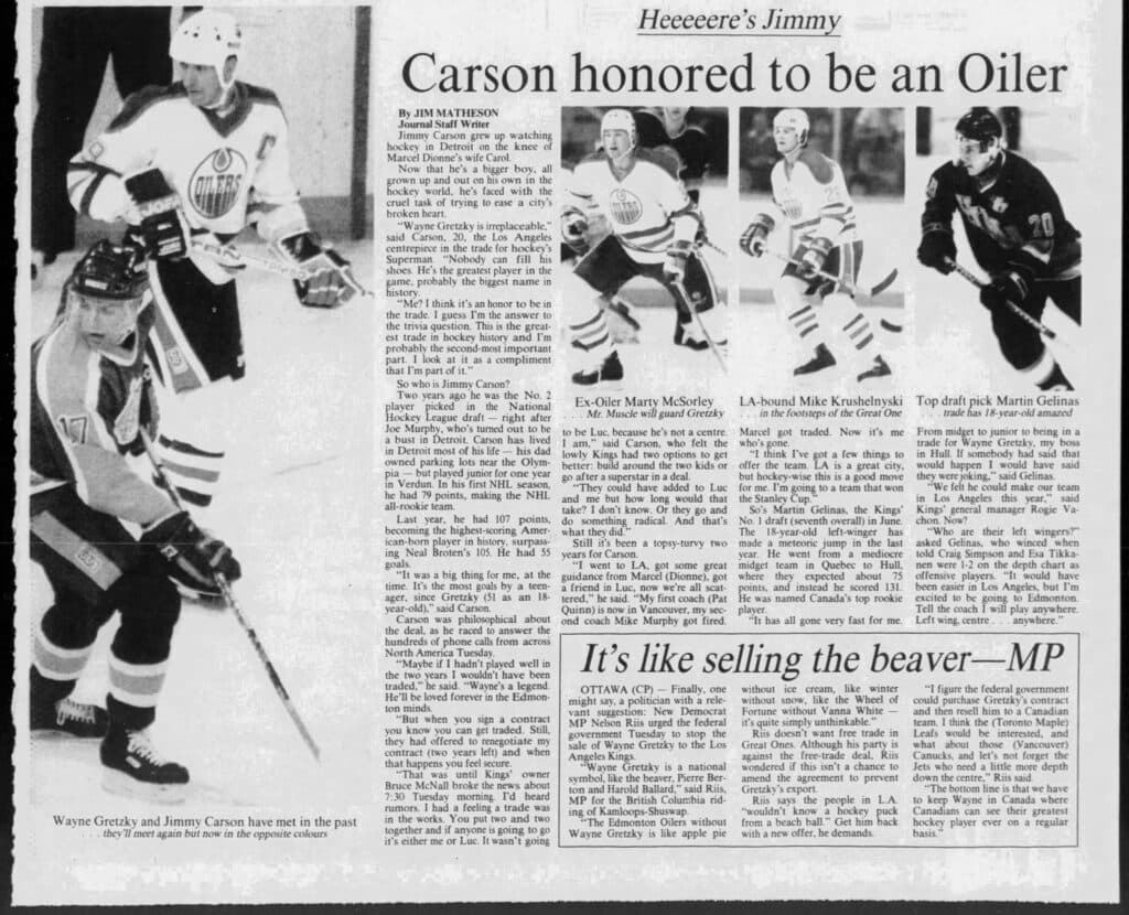 Edmonton acquired Carson on August 9, 1988, in a blockbuster that also brought Martin Gelinas and three first-round picks to the Oilers, along with a lot of cash into Peter Pocklington’s bank account.