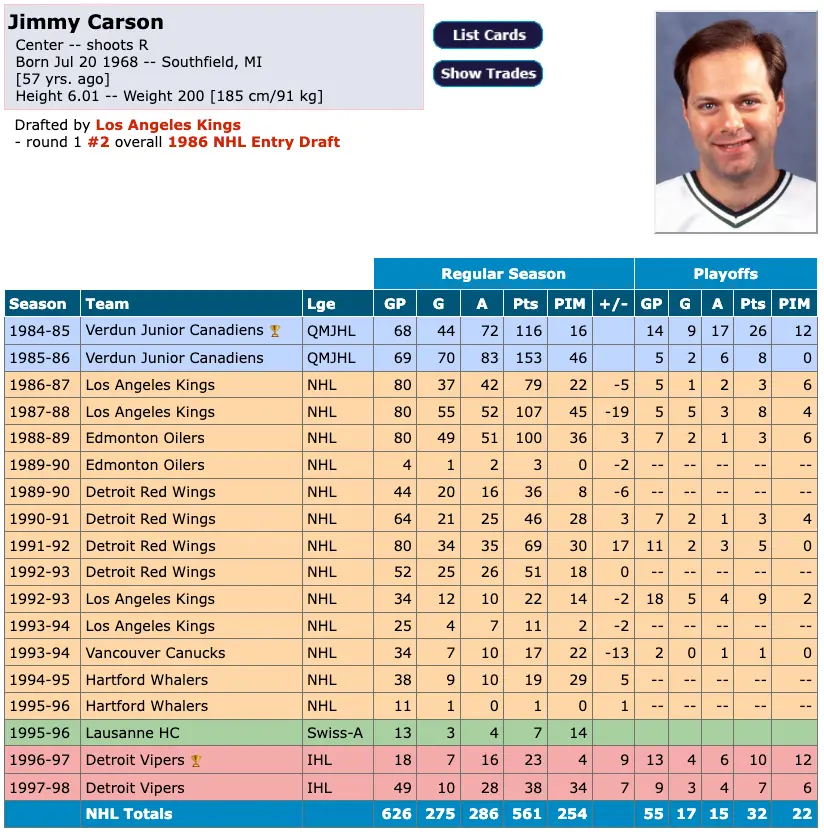 Across a career that included stops in Los Angeles, Edmonton, Detroit, Los Angeles again, Vancouver, and Hartford, Carson scored 275 goals and 561 points over 626 NHL games.