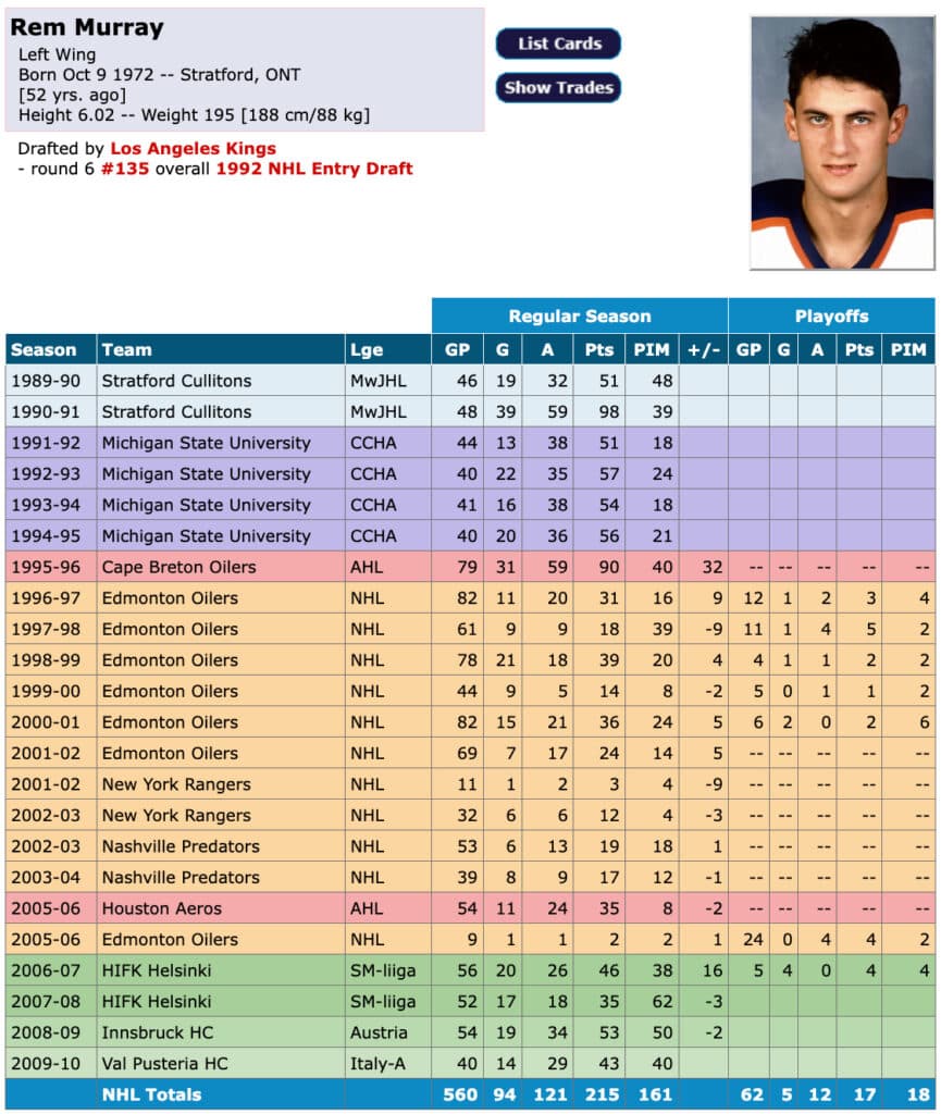 Murray was drafted by the Kings in the sixth round of the 1992 draft but would never sign with them and his aforementioned college hockey stint saw him score 71 goals and 218 points in 165 games. He would spend five and a half seasons with the team from 1996-97 through March 2002, when the Oilers traded him to the New York Rangers alongside Tom Poti for a fourth-round pick and Mike York, who would help provide some offensive punch for the early 2000s Oilers.