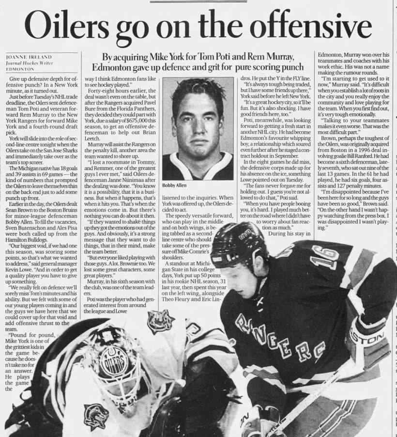 Murray remained in New York until Dec. 2002, later traded to the Nashville Predators, and would return to Edmonton in 2005-06, playing nine regular season games and playing a depth role in the Oilers’ cup run that year.