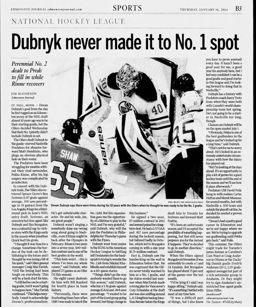 Devan Dubnyk was once pegged as the future in Edmonton’s crease. Unfortunately for our friend Dubey, those years overlapped with one of the roughest stretches in franchise history.
