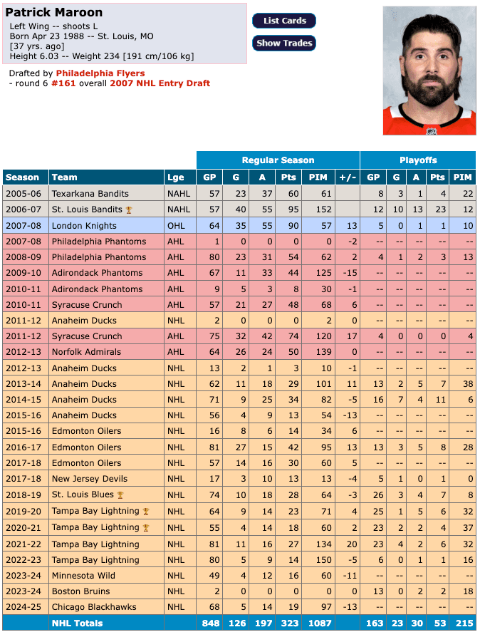 After Edmonton, Maroon joined his hometown St. Louis Blues and helped the team win their first-ever Stanley Cup in 2018-19. Maroon then won back-to-back Stanley Cups with the Tampa Bay Lightning in 2020 and 2021, putting him in the company of NHLers who have won at least three consecutive championships.