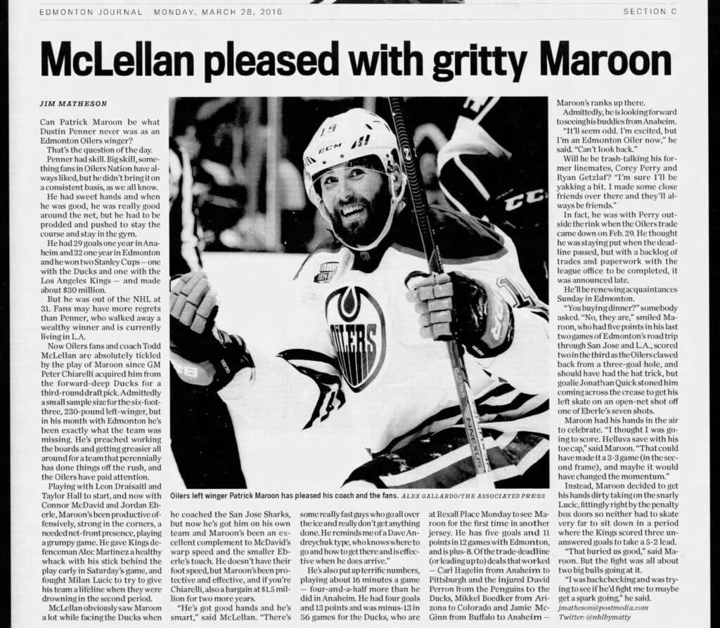 In the final weeks of 2015-16, Maroon scored eight goals in 16 games and, more importantly, clicked with rookie Connor McDavid. That chemistry is what ultimately launched the career of an eventual three-time Stanley Cup champion.