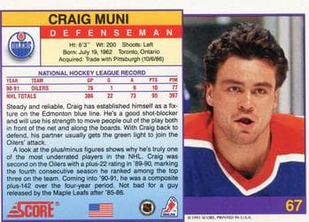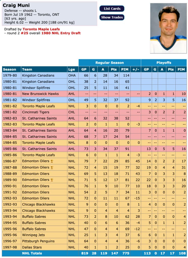 As a kid growing up in Toronto, Craig Muni’s dream was to one day play in the NHL for his hometown Maple Leafs. While he’d realize that questionable achievement, albeit modestly by playing in just 19 games over parts of four seasons in Hogtown after being drafted from the Kingston Canadians, Muni made his mark – it might be more accurate to say he left his mark – as a member of the Edmonton Oilers.Muni’s calling card was the good-old fashioned hip-check, which was already something of a lost art by the time he arrived in Edmonton as a free agent for the 1986-87 season. Muni was a hellacious – those who suffered shredded knee ligaments along the way might say he was dirty — open-ice hitter who spent 493 games patrolling the blueline for the Oilers. He was Bryan Marchment before Mush came along.An average skater with modest offensive skills, Muni was one of the NHL’s most feared hitters during his time with the Oilers, a tenure that saw him win three Stanley Cups. With all the dazzling skill the Oilers had up front with the likes of Wayne Gretzky, Mark Messier, Jari Kurri and Glenn Anderson, it was Muni who took care of the dirty work on the back end, low-bridging opposing forwards as a penalty killer and third-pairing guy.Muni was decidedly unspectacular in most facets of the game – until he sent somebody cart-wheeling with one of those hip-bone-connected-to-the-knee-bone hits. Muni was, without a doubt, a player who would be deemed a predatory hitter today. I can’t imagine how much he’d pay in fines and how many games he’d spend serving suspensions under the rules now.