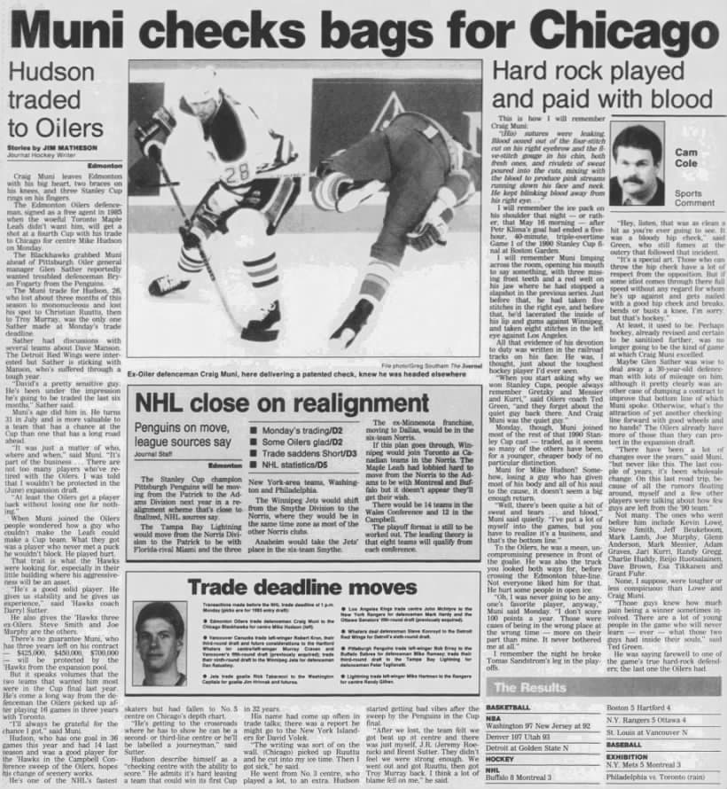 As Lowetide alluded to in a Nation Profile years ago, Muni would be property of four NHL teams in October 1986. The Oilers signed him as a free agent on August 18th of that year, sold his rights to the Buffalo Sabres for cash on October 2nd, who did the same a day later, sending him to the Pittsburgh Penguins.