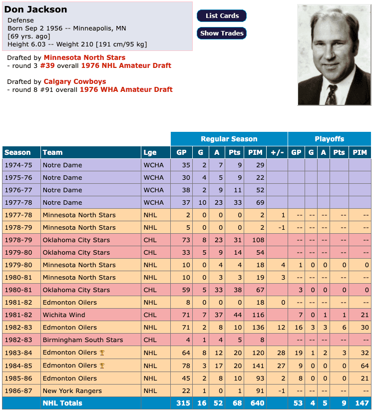 There’s not a lot of room left on the marquee when you’ve got stars named Wayne Gretzky, Mark Messier, Glenn Anderson and Paul Coffey hogging the spotlight the way they did with the Edmonton Oilers in the early 1980s on the way to Hockey Hall of Fame careers. Don Jackson was always fine with that. Singers sing, dancers dance. Everybody has a job to do.On a team full of thoroughbreds who’d tear up the track and bring fans to their feet in Edmonton and around the NHL as the Oilers rose up the ranks, Jackson, a big defenseman from Minnesota, was a plough horse. He was one of what people call the lesser lights, doing the grunt work in the background while his more talented teammates took centre stage. It was honest work. Necessary work.Jackson’s NHL career spanned just 311 games, 262 of those with the Oilers, but he dropped the gloves a total of 43 times. Jackson was a willing, if not particularly adept, scrapper. He was the kind of guy teammates could count on to have their backs in any situation – that came in handy when the Battle of Alberta really was a battle. Playing in a support role, sticking his nose in when needed, was Jackson’s forte.You can watch a clip of the Oilers and Flames going at it here with Jackson in the middle of the action. Some more Jackson, with Jim Peplinski, here. For a bit of comedic relief, you can watch Jackson, then coaching Cincinnati in the IHL, throwing down with Atlanta Mascot Sir Slapshot. It’s here. That dust-up cost Jackson a 10-game suspension. Suffice to say, Jackson more than made up for his lack of natural ability with a willingness to compete.