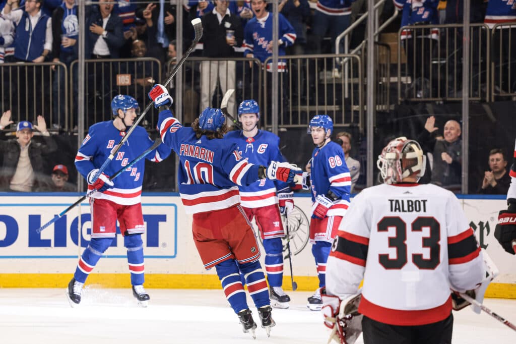 Mar 2, 2023; New York, New York, USA; New York Rangers defenseman Jacob Trouba (8) celebrates his goal against Ottawa Senators goaltender Cam Talbot (33) with teammates during the second period at Madison Square Garden. Mandatory Credit: Vincent Carchietta-USA TODAY Sports