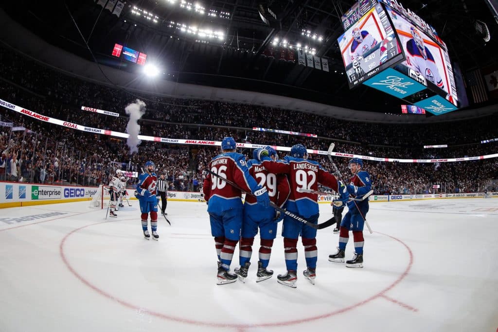 Jun 2, 2022; Denver, Colorado, USA; Colorado Avalanche center Nathan MacKinnon (29) celebrates his goal with right wing Mikko Rantanen (96) and left wing Gabriel Landeskog (92) and defenseman Cale Makar (8) in the third period against the Edmonton Oilers in game two of the Western Conference Final of the 2022 Stanley Cup Playoffs at Ball Arena. Mandatory Credit: Isaiah J. Downing-USA TODAY Sports