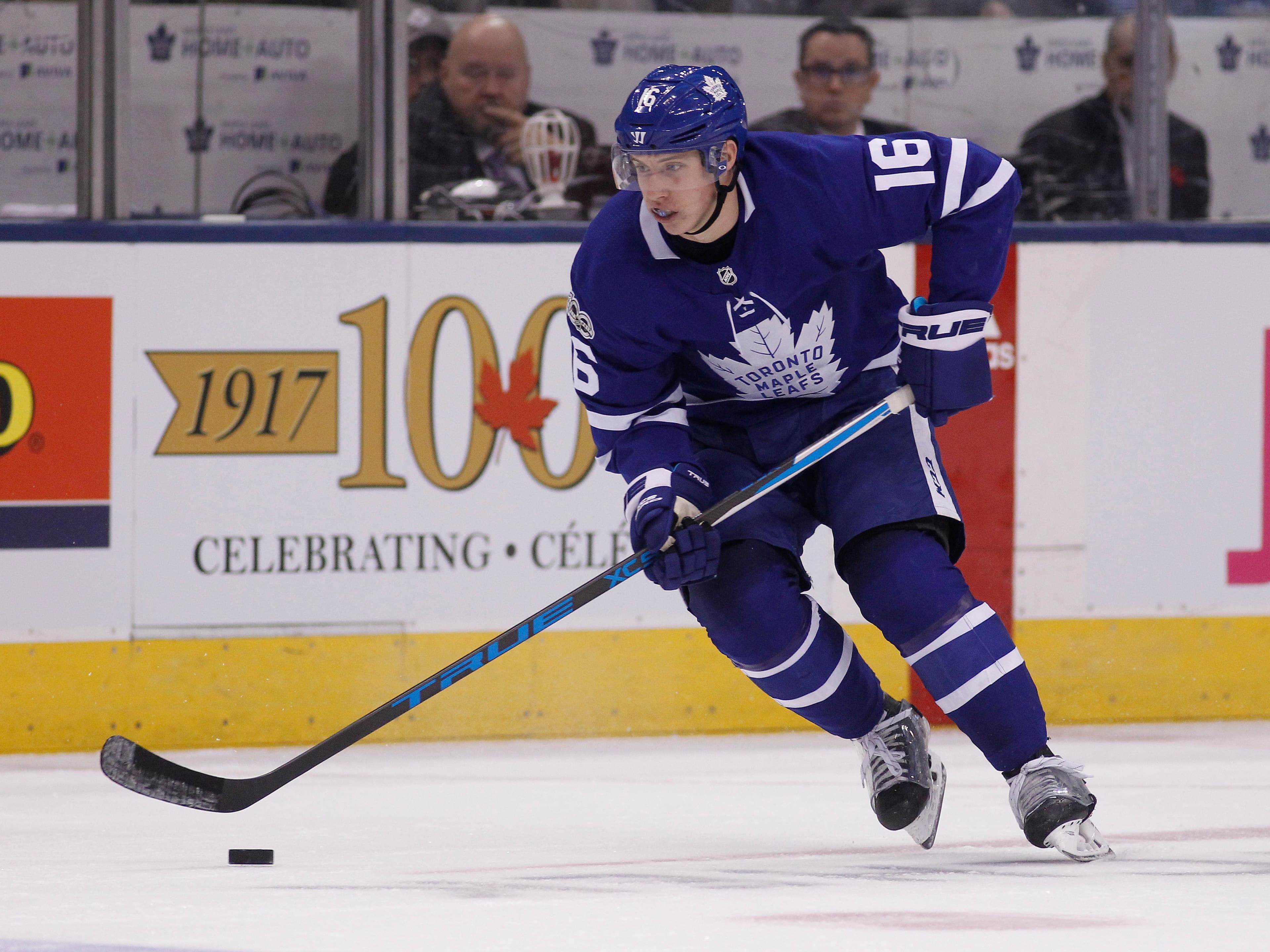 Nov 6, 2017; Toronto, Ontario, CAN; Toronto Maple Leafs forward Mitch Marner (16) skates with the puck against the Vegas Golden Knights at the Air Canada Centre. Mandatory Credit: John E. Sokolowski-USA TODAY Sports