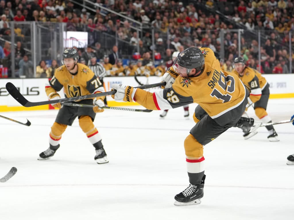 Oct 22, 2022; Las Vegas, Nevada, USA; Vegas Golden Knights right wing Reilly Smith (19) shoots the puck against the Colorado Avalanche during the third period at T-Mobile Arena. Mandatory Credit: Stephen R. Sylvanie-USA TODAY Sports
