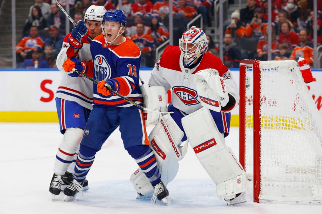 Dec 3, 2022; Edmonton, Alberta, CAN; Edmonton Oilers forward Tyler Benson (16) battles with Montreal Canadiens forward Jake Evans (71) in front of goaltender Jake Allen (34) during the first period at Rogers Place. Mandatory Credit: Perry Nelson-USA TODAY Sports